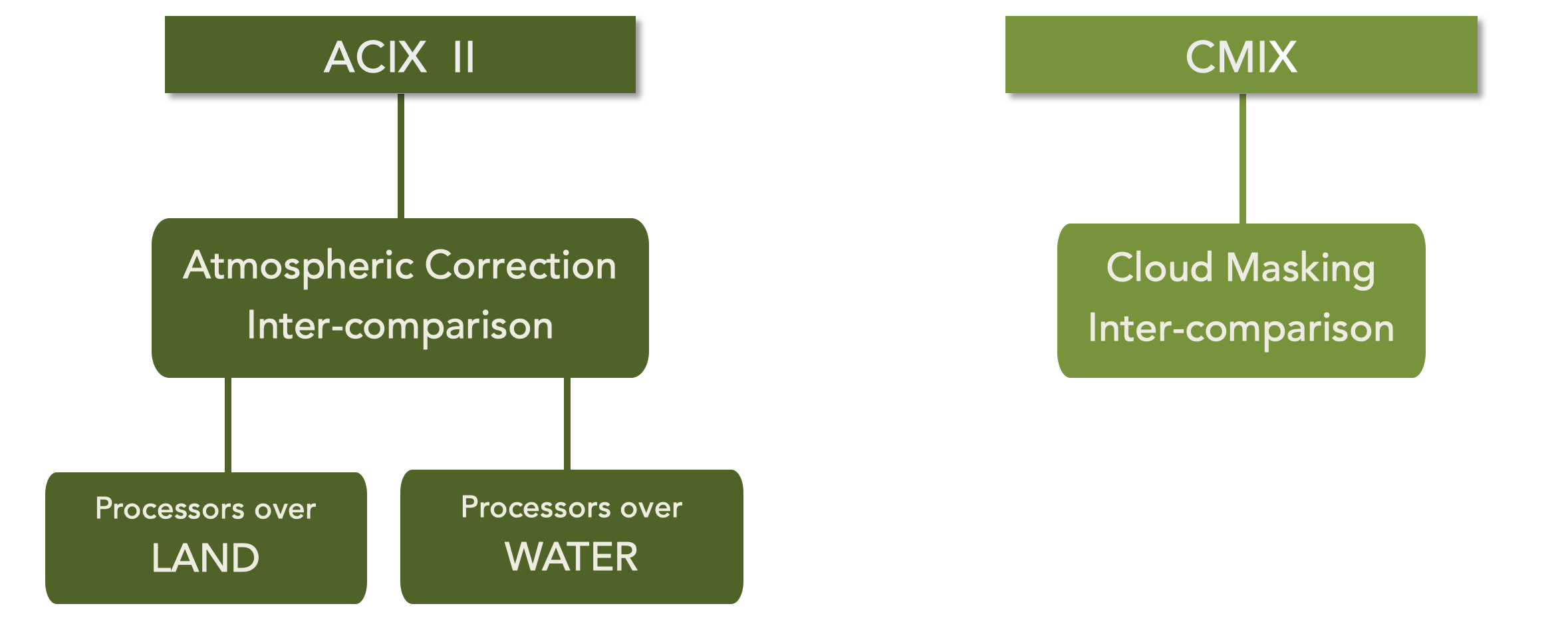 ACIX aims to bring together the developers of Atmospheric Correction (AC) processors, who are invited to generate the corresponding Bottom-Of-Atmosphere (BOA) products. The input data are Landsat-8 and Sentinel-2 imagery of various sites. A common and harmonised inter-comparison procedure is agreed and followed by all the participants.